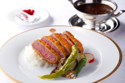 赤肉と霜降りの2つの部位の美味しさが絶妙なバランスが特長の“飛騨牛”のカツレツと、スパイスや香辛料を効かせ玉ネギの甘味を加えたプレミアムなカレーソースをご堪能ください。