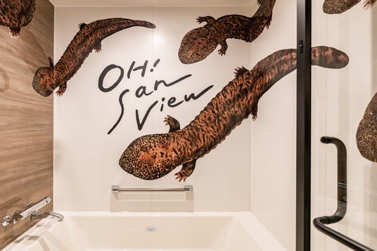本日、7月19日から販売する期間後半の宿泊プランには、OH! San View Roomを彩るオオサンショウウオイラストをモチーフに「注染手ぬぐい にじゆら」で染め上げたオリジナルの手ぬぐいと、京都水族館で今年4月に販売されるやいなや、そのリアルな造形で人気商品となった「おおさんしょううおらくがん」、そしてオオサンショウウオルームウェアがセットになります。オーシャンビューならぬ、“オオサン”ショウウオ”ビュー”のごとくオオサンショウウオを愛で、オオサンショウウオに囲まれながらオオサンショウウオの世界をご堪能ください。