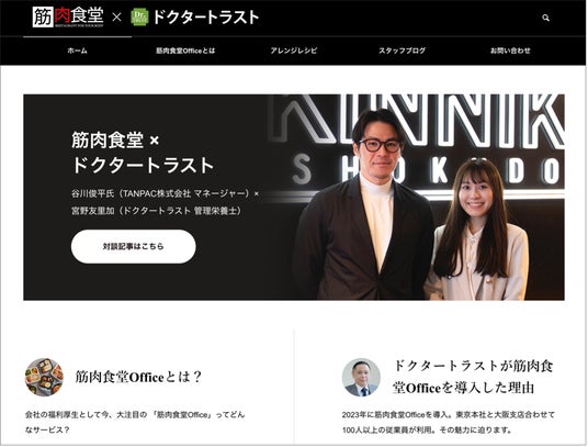 高たんぱく低カロリーのグリルダイニング「筋肉食堂」を運営するTANPAC株式会社(本社:東京都渋谷区、代表取締役:中崎祐史、以下「TANPAC」)と、企業で働く人の健康管理を専門に受託している株式会社ドクタートラスト(本社:東京都渋谷区、代表取締役:高橋雅彦、以下「ドクタートラスト」)は、共同プロジェクトを通じて、食の分野から働く人の健康にアプローチする取り組みを開始します。