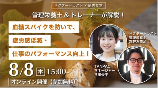 【8月8日オンライン開催!】筋肉食堂×ドクタートラスト コラボ無料セミナー第1弾管理栄養士&トレーナーが解説!血糖スパイクを防いで、疲労感低減・仕事のパフォーマンス向上!