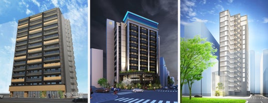 左より、大阪なんば、福岡博多、広島平和大通り 新規ホテル外観イメージ