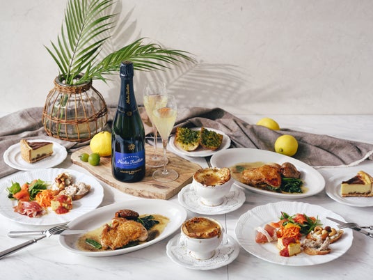 今回は、バイザグラスとボトルはもちろん、ランチ、ディナータイムにお楽しみいただけるコラボレーションコースを期間限定でご用意。自家製ポークリエットやゴルゴンゾーラムースのハニーナッツカナッペ、ムール? ?ワイン蒸しなど、力強さに加えて、果実味もしっかり感じられるフレッシュでイキイキとした味わいの「レゼルヴ・エクスクルーシヴ ブリュット」にぴったりなラインアップです。