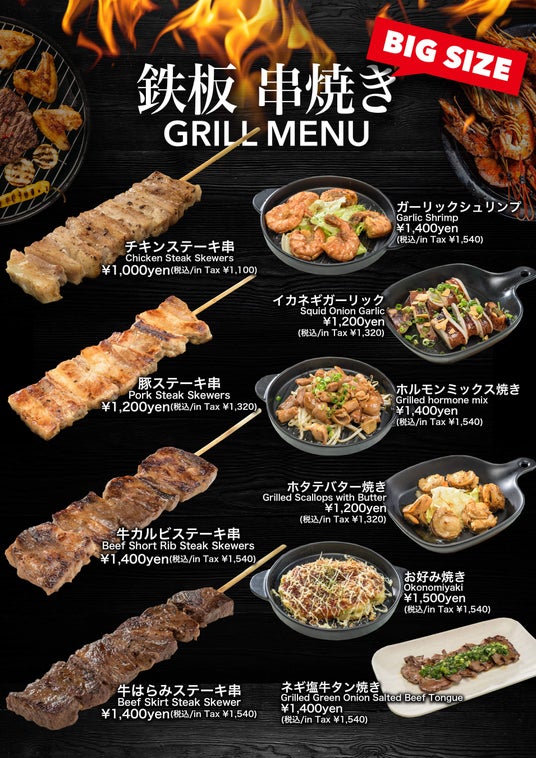 鉄板串焼き GRILL MENU / チキンステーキ串 1,000円 +税 など