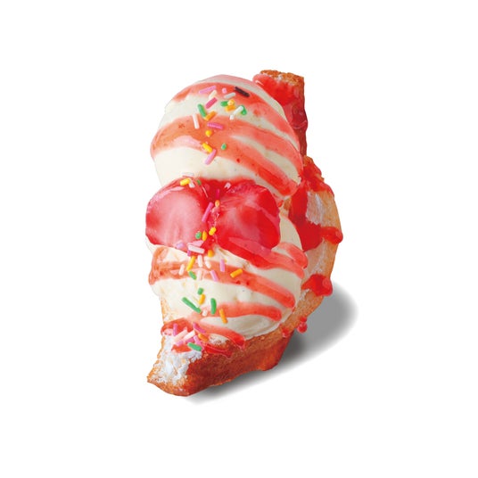 ジャムいちご揚げたてのパンに低糖質ホイップクリームを詰め、バニラアイスをON!バニラアイスはバニラビーンズをたっぷり使用した、クリーミーで濃厚な味わい。いちごソース、トッピングのいちごとチョコスプレーは、写真映えも抜群で、SNSでシェアするのにもぴったりです。