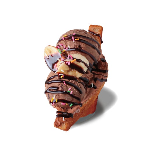 チョコバナナ揚げたてのパンにチョコクリームを詰め、チョコアイスをON!チョコアイスはベルギー製クーベルチュールを使用したビターな味わいが特徴で、口溶けが滑らかです。さらに、チョコソースをたっぷりとかけ、バナナとチョコスプレーをトッピング。チョコ好き必見のアイス揚げサンドです。