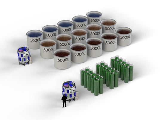 1250リットルのバイオリアクターの連続培養によって生産される微細藻類の量は、タンクを使うバッチ培養の75,000リットル分 (5,000L/タンク x 15)、または、バッグ式連続培養の12,000L分(400L/バッグ x 30)に相当