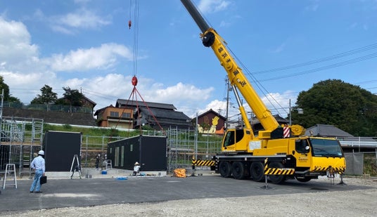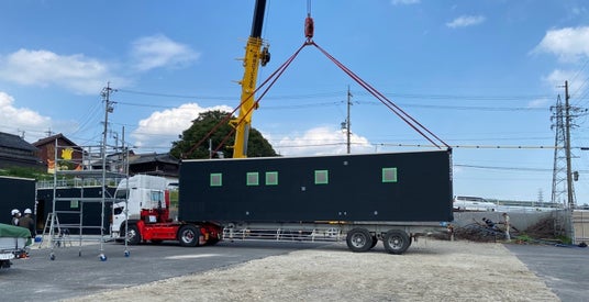 運ばれてくる仮設住宅用のコンテナ