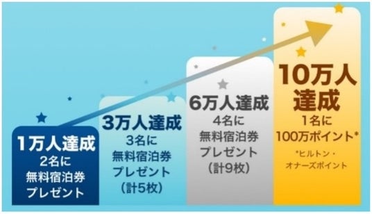 - 1万人増加:2名様にヒルトン・グループのホテルの無料宿泊券(1泊分)をプレゼント