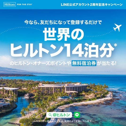 ヒルトン 日本・韓国・ミクロネシア地区(所在地:東京都新宿区、代表:ジョセフ・カイララ)は、LINE公式アカウント開設2周年を記念し、世界中のヒルトン・グループのホテルで利用可能な無料宿泊券や14泊相当分※のヒルトン・オナーズポイントが当たるキャンペーンを2024年8月20日(火)まで実施しています。