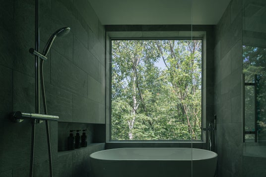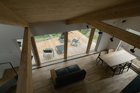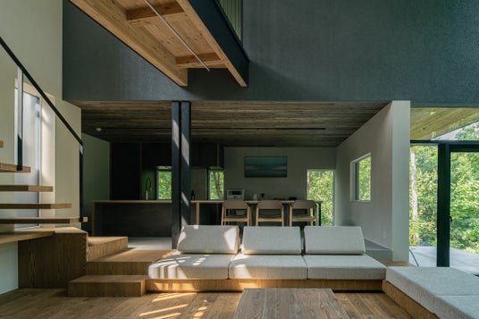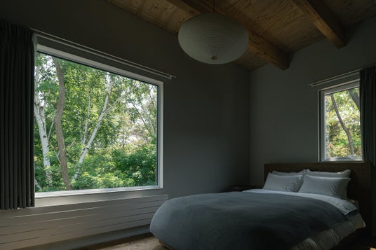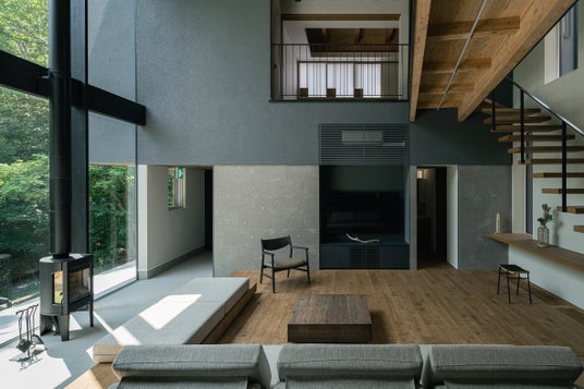 吹き抜けの窓一面に森が広がり、自然を取り込んだ室内空間が印象的な「山郷 春 Villa -SHUN-」
