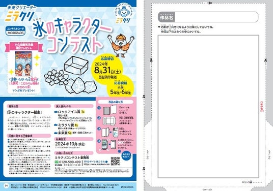 「未来クリエーター氷の”冷やすチカラ”にどきどき」の応募ページで、かっこいい、かわいいと思うオリジナルの氷のキャラクターを描いて応募できる「氷のキャラクターコンテスト」です。応募頂いた作品の中から、厳正な審査のうえ、ロックアイス賞、ミラクリ賞、未来賞の入賞者を決定します。コンテスト結果は、2024年10月以降に公式ホームページで公開予定です。