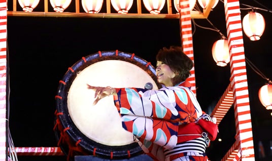 会場で毎夜繰り広げられる盆踊りを盛り上げてくれるのは「野和太鼓」のメンバー。炭坑節といった昔なじみの曲に加えて、ポップスも使った新しいタイプの盆踊りが楽しめます。