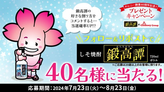 はなちゃん@チムニー宣伝部のXアカウントまたはInstagramアカウントをフォローすることでキャンペーンに参加可能。40周年の感謝の気持ちを込めて、40名様にしそ焼酎「鍛高譚」や「チムニーグループ全店でご利用いただけるお食事券4,000円分」をプレゼントいたします。