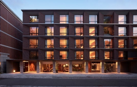 当ホテルの外観は、三条通の特徴である明治以降の近代建築の景観との調和を図りながらも現代的な建築デザインとなっています。また、煉瓦調のタイルや近代建築の様式を引用し、積層する縦の規律性ある柱のリズム感を採用。さらに、歴史的建築をオマージュし、水平に走る横の連続性をステンレスのラインを配して表現しました。