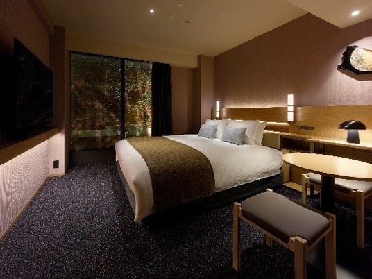 客室のカラーテーマは、京都伝統の着物・織物からインスピレーションを得た「かさねの色目」となっております。日本の伝統色である「梅鼠」で仕上げた壁紙や、「青鈍」を意識したカーテン、カーペットなど、色を重ねた空間を演出。