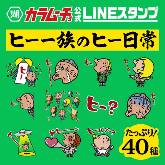さらに、「カラムーチョ」の発売40周年を盛り上げるべく、LINEヤフー株式会社(社長:出澤剛)が運営する無料通話・無料メールアプリ「LINE(ライン)」のクリエイターズマーケットにおいて、「カラムーチョ」公式のLINEクリエイターズスタンプ「カラムーチョ ヒー一族のヒー日常」が発売されました。大人気の「ヒー 一族」の日常をエキサイティングに描いた使いやすいラインナップでありつつも、「ヒー」だけですべてを表現する、遊び心満載のスタンプです。40周年を迎えた「カラムーチョ」の新キャラクター「ヒー 一族」のLINEクリエイターズスタンプをぜひダウンロードして、使ってくださヒー!!