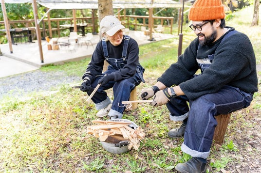 ブッシュクラフトの火起こしワークショップ。晴れの日は公園で思い切り遊んだり、屋外のワークショップに参加したり。
