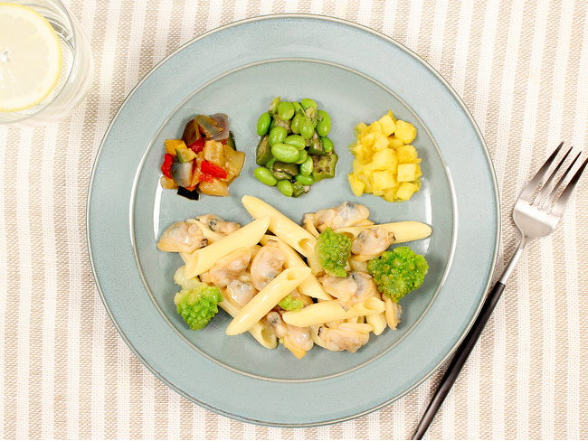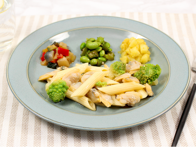 レモン好きの企画者一押し!爽やかなレモンの香りがたまらない、あさりをたっぷり使用したボンゴレ風ペンネの登場です!旨み抜群のソースにレモン果汁を加えることで、暑い時期にぴったりの味わいとなっております。いつもとは違う、あさりのパスタを是非召し上がっていただきたいです!独特の形と食感が楽しいロマネスコを添え、見た目にも楽しく仕上げております。