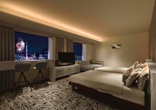 毎年人気の花火が見えるお部屋は、公園に面しているため視界を遮る建物が少なく、東京スカイツリー(R)と花?の競演をお部屋からゆっくりお楽しみいただけます。快適なお部屋で贅沢な時間をお過ごしください。詳細はこちらからご確認ください。