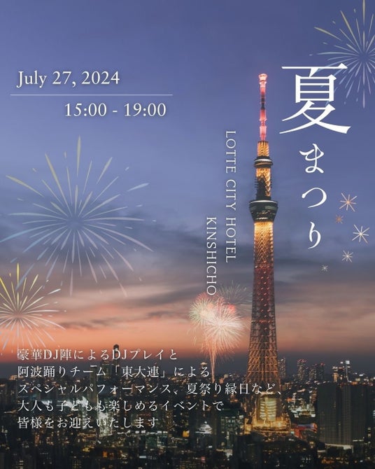 ロッテシティホテル錦?町(所在地:東京都墨田区錦?4-6-1、総支配人:福井朋也)は、7月27日(土)に開催される「第47回隅田川花火大会」に合わせて、一夜限りの特別プランを販売しております。当日はホテルのテラスで、多彩な音楽や踊りのステージをお楽しみいただける夏祭りイベントも開催し、お祭りムード一色の一日をお過ごしいただけます。