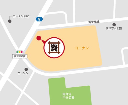 「資さんうどん 南津守店」は、ホームセンター「コーナン南津守店」の駐車場内に新設されます。地下鉄四ツ橋線 北加賀屋駅より徒歩約15分、お車をご利用の場合は阪神高速堺線 玉出インターより15分と、公共の交通機関でもお車でも、便利にご利用いただけます。駐車場は「コーナン南津守店」と共用となり、同敷地内にはスーパーマーケットや100円ショップも出店しているため、日用品のお買い物時のお立ち寄りや、週末のお出かけ時のお食事など、様々なシーンで活用ください!