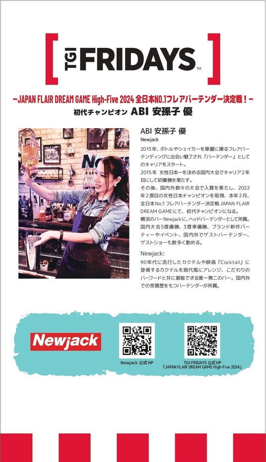 TGI Fridays Japan(本社:東京都大田区/以下:TGI フライデーズ)は、世界55か国で850店舗以上を展開する世界最大級のアメリカンカジュアルダイニングチェーンです。2024年2月18日(日) 東京渋谷 TK-NIGHTCLUBで開催された 『JAPAN FLAIR DREAM GAME High-Five 2024 / 全日本No.1フレアバーテンダー決定戦!』 において、初代チャンピオンに輝いた ABI 安孫子 優 監修のカクテルを7月25日(木)から8月8日(木)までの期間限定で国内全12店舗にて販売いたします。
