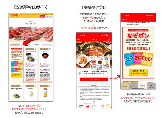 「なぞポン」は安楽亭WEBサイトまたは安楽亭アプリで引くことができます。