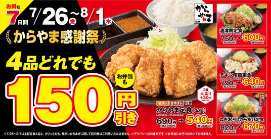 とんかつ専門店「かつや」などを展開するアークランドサービスホールディングス株式会社の子会社、エバーアクション株式会社(本社:東京都千代田区/代表:渡部 貴、以下当社)は、2024年7月26日(金)から8月1日(木)の7日間、国内のからあげ専門店「からやま」にてお客様感謝祭を開催し定食1番人気の「からやま定食(4個)」をはじめ人気の定食4品がどれでも150円引き、からあげ2種を各種1個100円(税込110円)と、お得な特別価格で販売いたします。