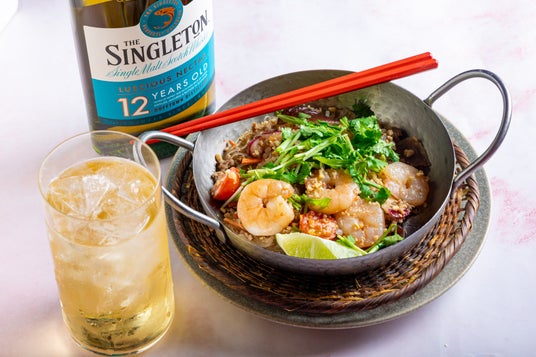 タイ定番の辛くて酸っぱい春雨サラダ。ナンプラーの香りと、仕上げに散らしたナッツの香ばしさがシングルトンの、ナッツのような軽やかな風味をひきたてます。プリッキーヌ(タイの青唐辛子)の辛味とすっきりとしたハイボールの組み合わせは食事のスタートにぴったり!