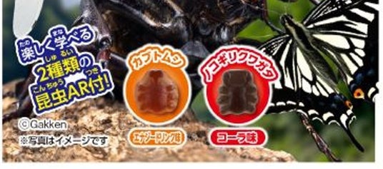 また本商品にはAR機能が付いています。ARAPPLI(アラプリ)というアプリをダウンロードしていただき、パッケージ表面のグミの写真部分を携帯でスキャンするとランダムで2種類の昆虫が飛び出てきます。