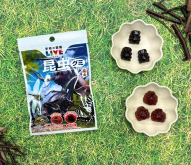 商品特徴:人気の図鑑シリーズ「学研の図鑑LIVE」とのコラボ商品です。カブトムシ(エナジードリンク味)・ノコギリクワガタ(コーラ味)の2種類の昆虫型グミが楽しめます。