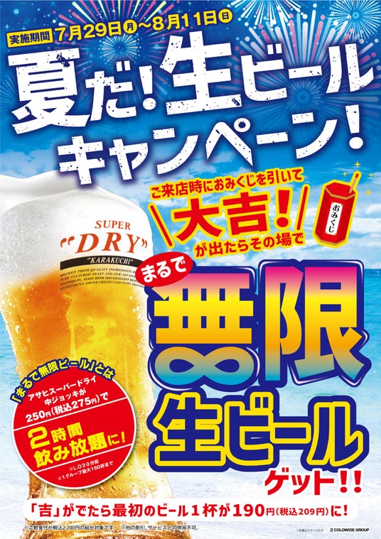 コロワイドグループの株式会社チアーズダイニングが展開する365酒場・やきとりセンター・酒場ヤキセンでは、来店時におみくじを引いて大吉が出たら、生ビール1杯分の価格で2時間※飲み放題になるキャンペーンを、2024年7月29日(月)より期間限定で実施します。※ラストオーダー30分前