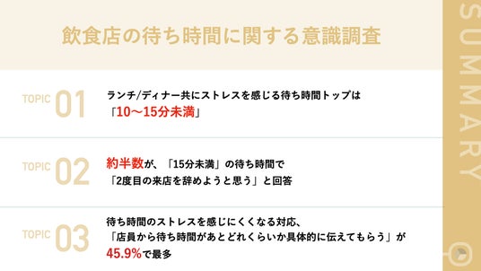 - Topic 01 ランチ時/ディナー時ともにストレスを感じる待ち時間トップは「10~15分未満」