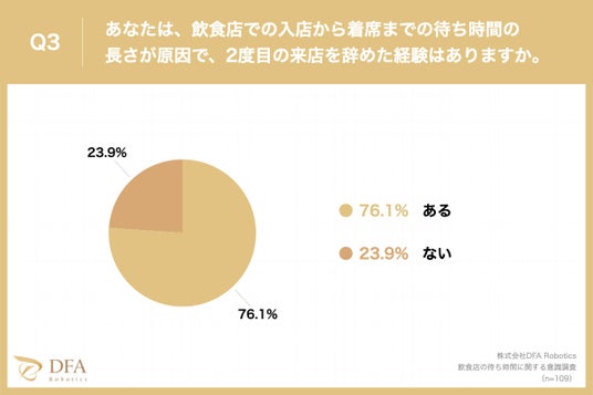 「飲食店での入店から着席までの待ち時間の長さが原因で、2度目の来店を辞めた経験はあるか?」という質問に対し、「ある」が76.1%、「ない」が23.9%という回答となりました。