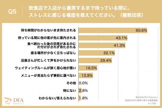 さらに、飲食店の待ち時間でストレスを感じる場面では「待ち時間がわからないまま待たされる」が60.6%で最も多く、次いで「待っている間に他の客が先に案内される」(43.1%)や「食べ終わった後の空席があるのに片付けがされず待たされる」(41.3%)が挙げられました。