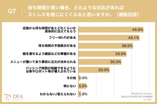 最後に、待ち時間のストレスを感じにくくなる対応としては「店員から待ち時間があとどれくらいか具体的に伝えてもらう」(45.9%)や「フリーWi-Fiがある」(43.1%)などが上位になり、残りの待ち時間を把握できることや、時間を潰せる環境の提供がストレス軽減に繋がることが明らかになりました。