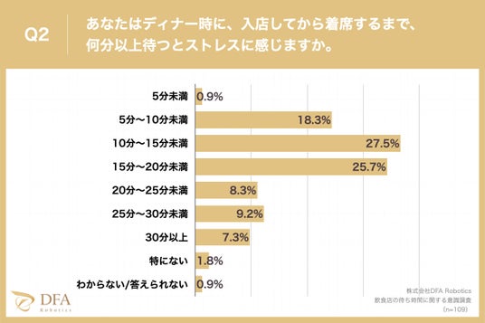 また、「ディナー時に、入店してから着席するまで、何分以上待つとストレスに感じるか?」という質問に対しても、「10~15分未満」が最も多い結果になりました。