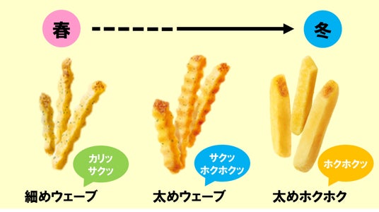 昨年より「Jagabee」では、じゃがいもの多様なおいしさを楽しんでいただきたいという想いから、年に1回しか出会えない「味わい×カット」を組み合わせた期間限定の「Jagabee」として、「季節のフレンチフライシリーズ」を展開しています。