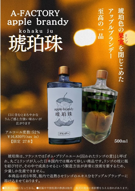 A-FACTORY青森工房(所在地:青森市)は、A-FACTORY アップルブランデー 「琥珀珠」を8月3日(土)より27本限定で発売します。