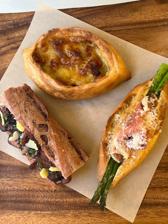 <ブーランジェリードゥ デジール>左から:赤ワインバゲットのローストビーフサンド 1,200円※各日50点限り/白ワイン生地で包んだサラミとチーズ 600円※各日40点限り/ジェットファーム長谷川さんのアスパラサンド 800円※各日50点限り
