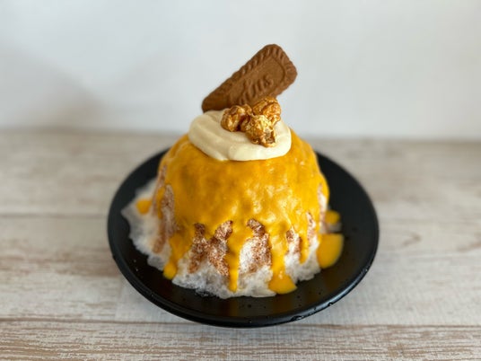 かき氷が名物の浦和の人気店からはあまじょっぱさが魅力的なフレーバーが登場します。まるでパンプキンチーズケーキのようなかき氷。チーズケーキクリームとかぼちゃソースの下には、アーモンドプラリネシロップと練乳ミルクシロップがかかっています。カラメルビスケットで香ばしいアクセントも加わって濃厚な構成をお楽しみいただけます。