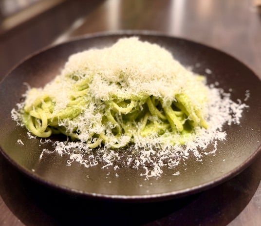フランス・イタリア・イギリス・スペイン各国の熟成士から厳選したチーズを直輸入し、徹底管理のもと取り扱っているチーズ専門店。バジルをたっぷり使用したジェノベーゼに生麺のパスタと羊乳のコクが広がるペコリーノチーズをたっぷりかけた一品です。
