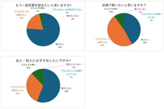 彩響を楽しんだお客様にアンケートを実施し「もう一度彩響を飲みたいと思いますか?」という質問には96%の人が「飲みたい※」と回答するなど、非常に高い評価を得ました。※「飲みたい」「どちらかといえば飲みたい」の合計