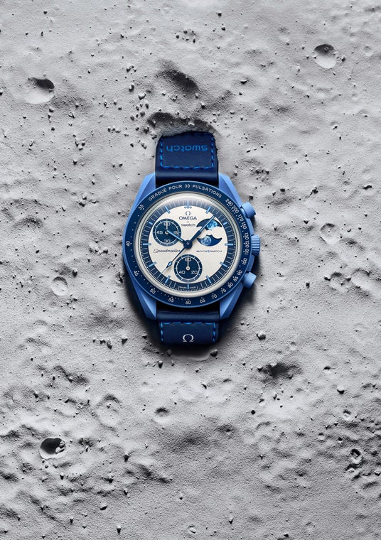 この新しい時計は、ケースバックに独自のミッションステートメントが刻まれ、ダイヤルとクラウンにはOMEGA XSWATCH のロゴがあります。バッテリーカバーには、さまざまなブルーの色調を示す月が描かれています。スペーススーツに適した青いVELCRO(R) ストラップは、宇宙飛行士にふさわしい装いを演出します。