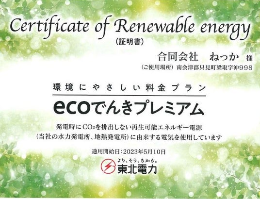 2023年5月から、ねっか奥会津蒸留所で使用するすべての電力は、東北電力様の発電時にCO2を排出しない、再生可能エネルギー電源を使用した電気に切り替わりました。蒸留機は化石燃料を使用したボイラーのため、蒸留時にはCO2が出ますが、蒸留方法をcにすることによってCO2排出量の削減に取り組んでいます。日本が様々な災害や環境問題を抱える今、私たちの取り組みが課題解決に向けた一助になればと考えています。
