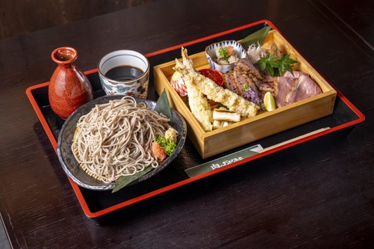 和牛の旨みを凝縮したローストビーフは、上品な旨味が口いっぱいに広がります。サクサクの海老天ぷらと共に、風味豊かな蕎麦をお楽しみください。