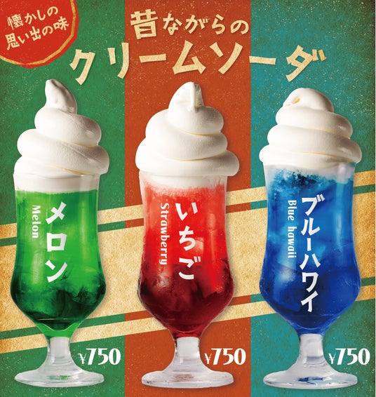各フレーバーには、たっぷりの当店自慢のオリジナルソフトクリームをのせており、炭酸とまろやかなソフトクリームが絶妙にマッチします。昭和レトロな見た目もお楽しみください。