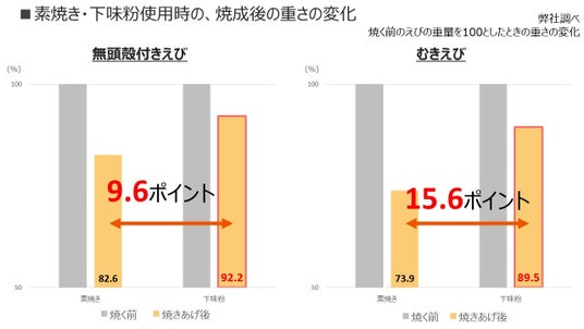 下味粉には生姜と塩が入っており素材の臭みを抑えつつ、水分と旨みを閉じ込める効果があります。素焼きと下味粉をつけた状態で焼成した時の重量の変化を比較すると、下味粉がついている方の重量が焼成前に近く、保水されていることがわかります。保水されることでエビはぷりっと、魚介はふっくらと仕上がります。