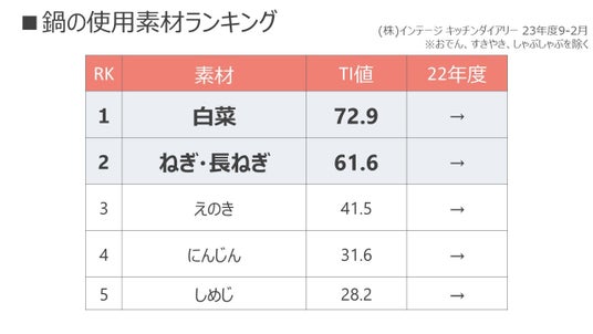 生活者が鍋で使用する素材に大きな変化はなく、白菜や長ねぎの食卓登場頻度が圧倒的に高いです((株)インテージ キッチンダイアリー 23年度9-2月※おでん、すきやき、しゃぶしゃぶを除く)。また、約半数の方が決まった味で鍋をしており、鍋高頻度層ほどいろいろなテイストの鍋を楽しんでいます(弊社調べ24年N=824)。このことから、素材とテイストの定番化が鍋のマンネリ化の一因と考えられます。