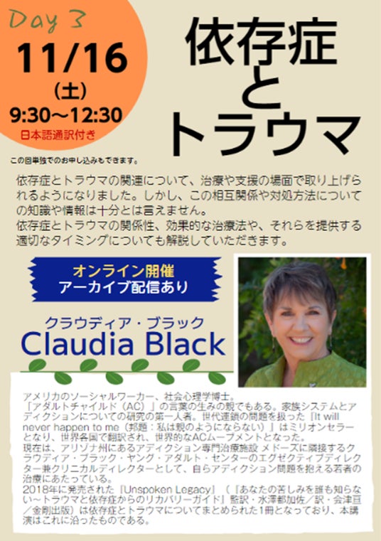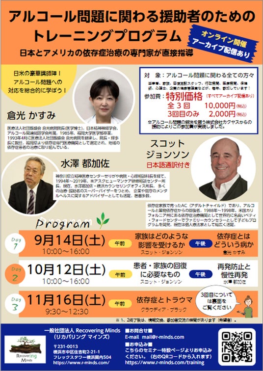 日本とアメリカの依存症治療の専門家が講師を務める全3回のプログラムで、新たな講師も増え、依存症治療についてより深く学ぶことができます。オンライン開催で例年多くの方にご参加いただいておりますが、今年からアーカイブ配信もございますので、日程のご都合が合わない方のご参加もお待ちしております。